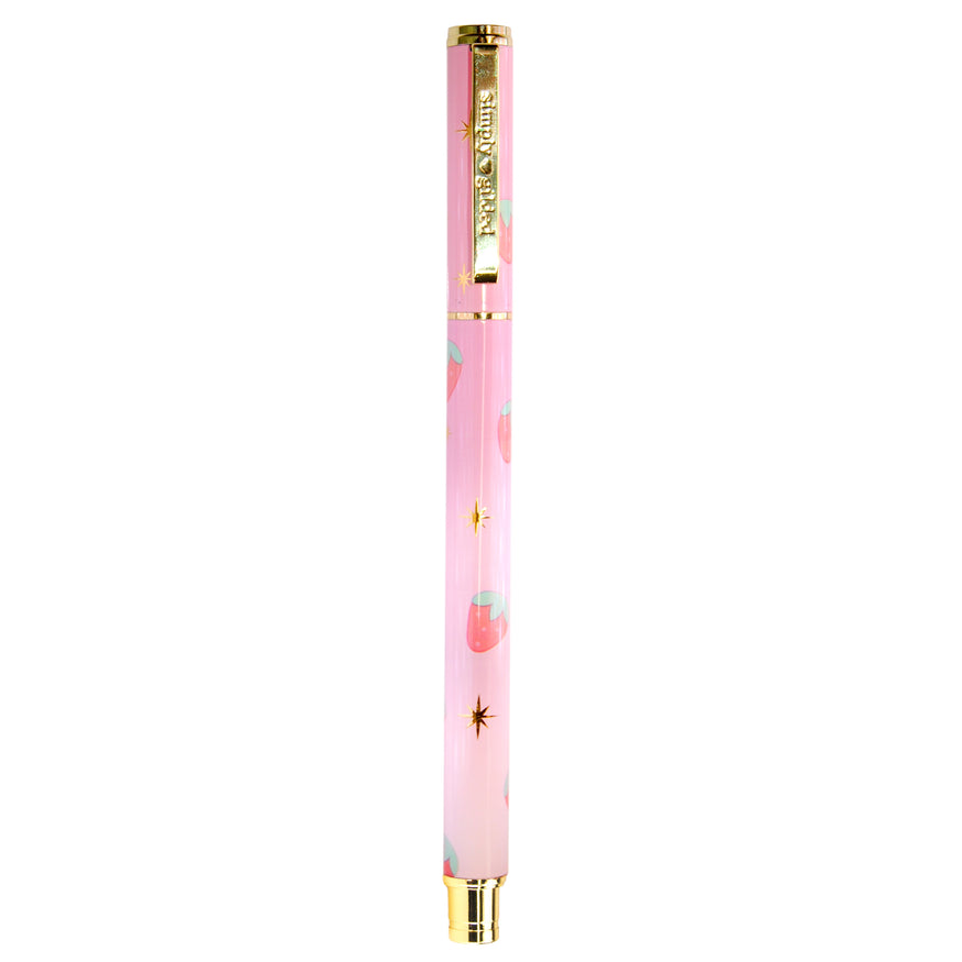 A pale pink pen with sweet strawberries and light gold accents on the barrel. This pen has a postable cap and light gold hardware.