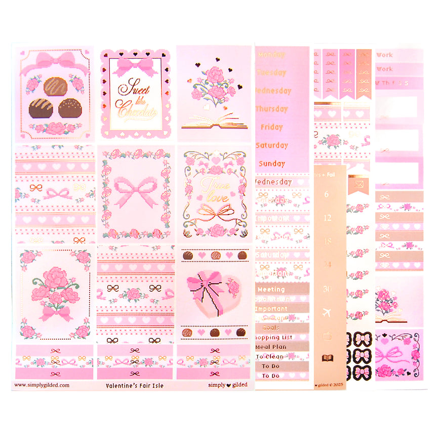 Valentine's Fair Isle Luxe sticker set (four sheets):Each sheet measures 12.5cm (width) x 18cm (height) - 4 15/16" W x 7 1/8" HBoxes measure 1 1/2" width x 2" heightHeaders measure 1 1/2" width x 3/8" height♥ rose gold foil
