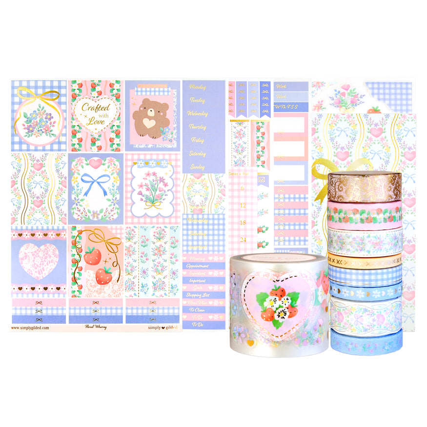 ♥ Floral Whimsy Diecut Rainbow Florals + satin gold foil - 20mm x 10m♥ Floral Whimsy Diecut wavy Buds + satin gold foil - 10mm x 10mm♥ Floral Whimsy Diecut Wavy Daisy + satin gold foil - 7.5mm x 10m♥ Floral Whimsy Diecut Wavy Strawberry + satin gold foil - 15mm x 10m♥ Floral Whimsy Stitched Vertical Florals + satin gold foil - 15mm x 10m♥ Floral Whimsy Gingham + satin gold foil - 10mm x 10m♥ Floral Whimsy Cross Stitch + satin gold foil - 6mm x 10m♥ Floral Whimsy Diecut Wavy Lace + satin gold foil - 15mm x 10m♥ Floral Whimsy PET tape + satin gold foil - 50mm x 10m