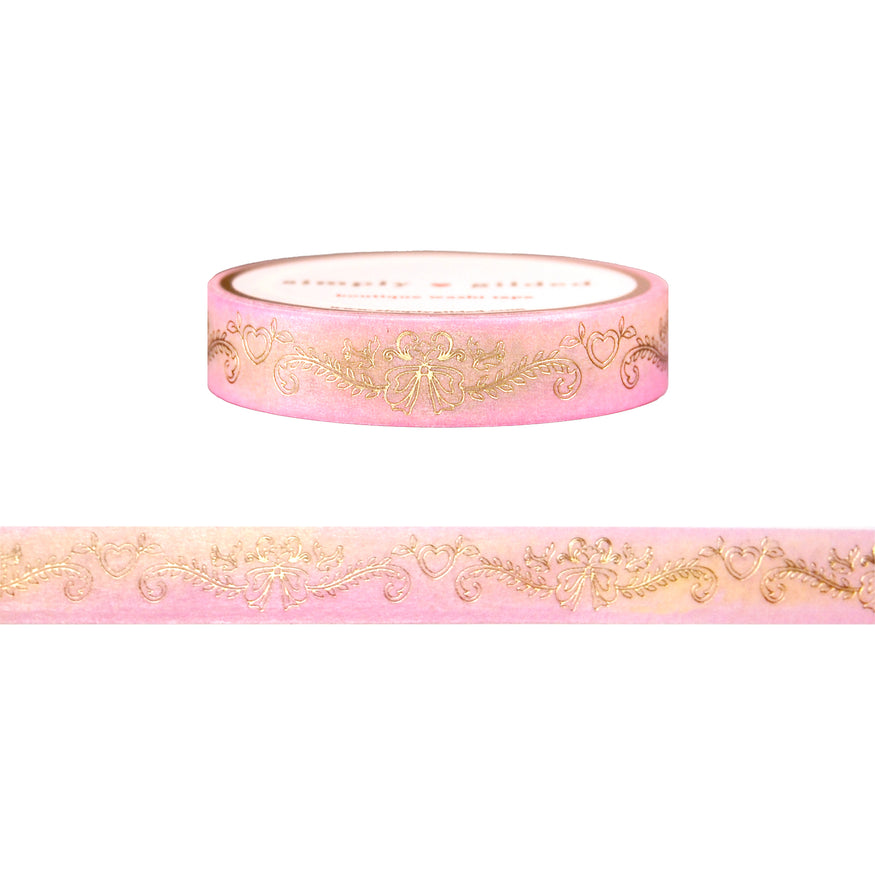 This soft life bow flourish washi features delicate bows, hearts, and graceful details that evoke elegance and calm with satin gold foil.