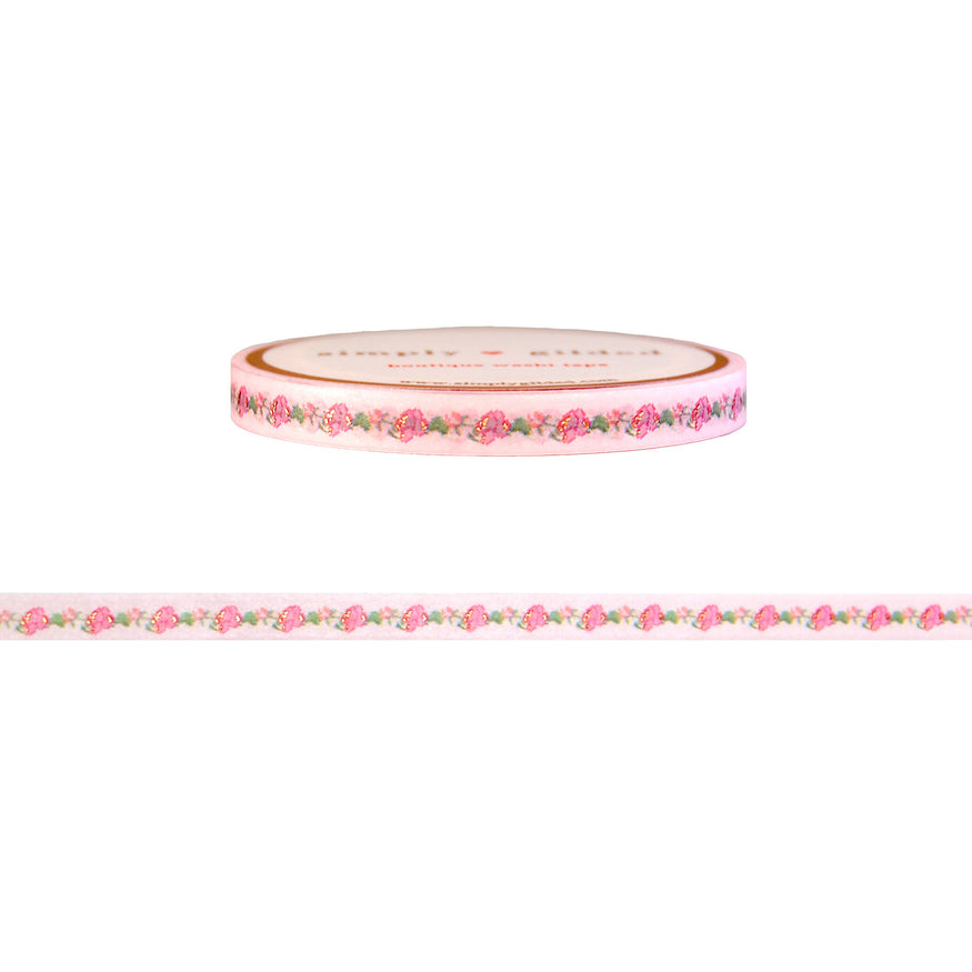 This washi features a chain of dainty roses on a soft pink background with rose gold foil.