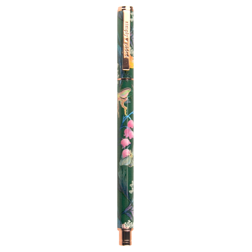 A green heat pressed floral design on the barrel pen. This pen has a postable cap and rose gold hardware.